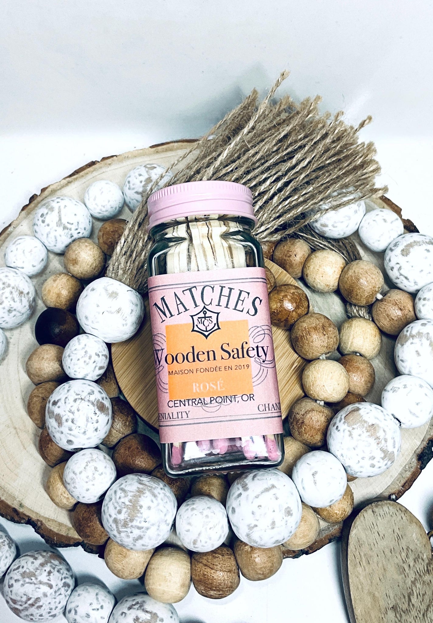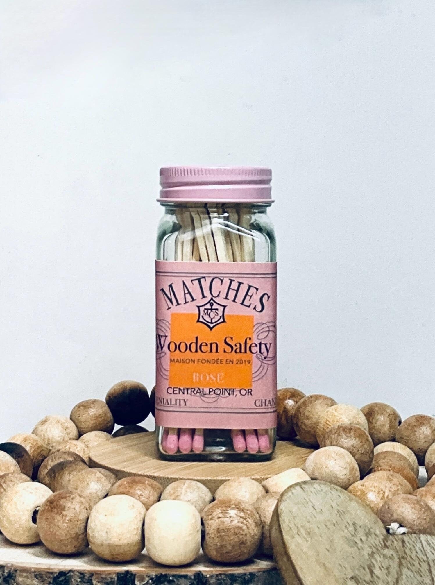 #40 Wooden Matches 3.75" in a 4 inch glass jar. Champagne-Inspired pink and Orange label.